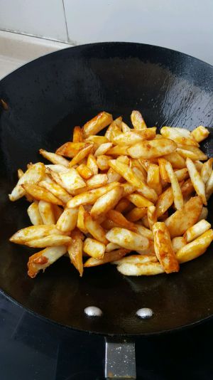 快速翻炒均匀,最好是颠勺。这样糖浆裹的很均匀而且不容易糊。但要注意安全小心糖浆溅出烫伤。