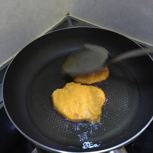 锅底放油,放进去煎就可以了。没有模型,所以不漂亮,其实味道一样的。煎成金黄色就可以了,不要太厚,里面才爱熟!