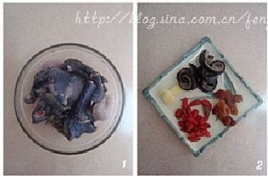 鸡腿洗净切成块备用。海参提前泡发好(海参是我随意加入的,可不放),元肉、枸杞洗净,姜切片待用。