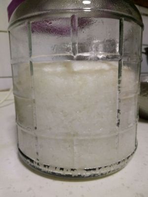 将拌好的糯米放在用开水消过毒的玻璃瓶里,压紧实一点。