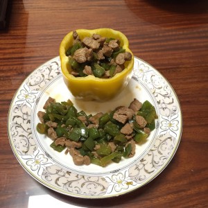 然后加青椒,加盐,炒一会,让青椒都沾上酱油色。