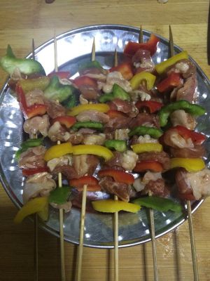 彩椒切成小块,用竹签依次穿彩椒和肉块
