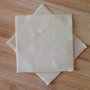 馄钝皮每两张错开摆放。
