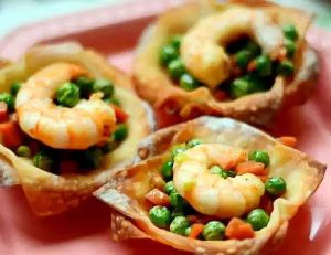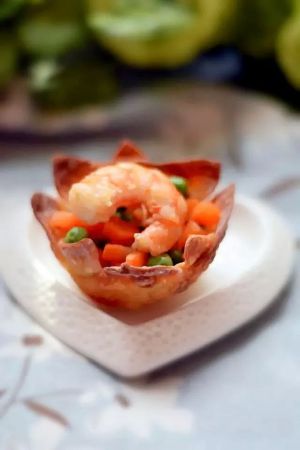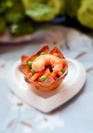 将炒好的虾仁和蔬菜放入烤好如意盏中。
