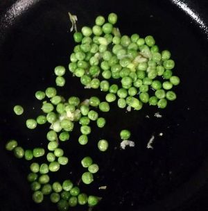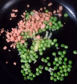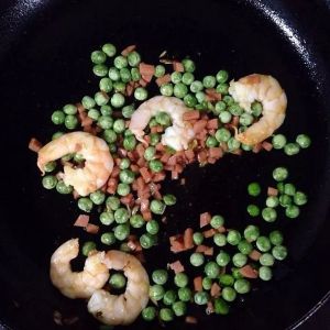 放入煮好的豌豆略炒片刻。