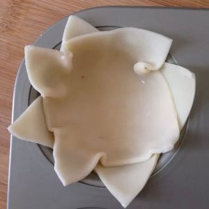 将交错摆放的馄钝皮放进蛋糕模具。