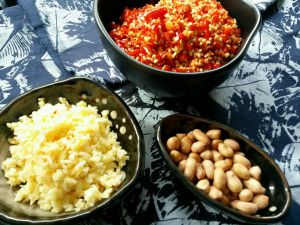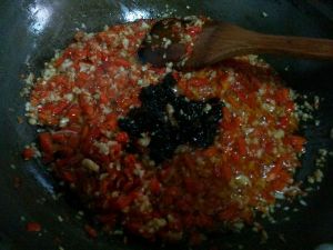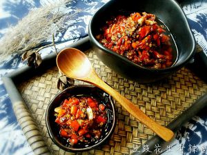 出香味时加入两勺豆鼓,花生也加入,小火慢熬翻拌均匀15分钟,加盐,酱油,老抽,鸡精调味