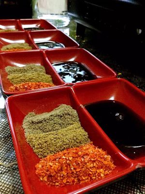 蚝油、辣椒面、自然粉跟各种香料配制好