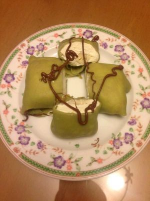 煎好的班戟皮冷却以后,就可以裹了。动物性淡奶油加入糖粉打发到可以保持花纹的程度。将班戟皮表皮(煎的时候没有贴着平底锅的一面)朝下铺好,在班戟皮上放入适量打发好的淡奶油,放上一块榴莲肉再放上适量打发好的鲜奶油。把班戟皮包成四方形,将馅完全包在皮里面,翻过来,榴莲班戟就做好了。做好后的班戟需放在冰冷存。冷藏后会让班戟更入味,更好吃!把做好的榴莲班戟切开,摆盘,在榴莲班戟上用裱花袋挤上细条的巧克力液,这样好看又好吃,看上去貌似满记甜品哦!