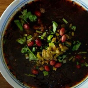 炒锅放适量水开锅后下入红薯粉,煮熟,在另取一个空碗,放入酸辣粉调料,加入30g保宁醋,适量胡椒粉,酱油,正好今天家里做的酱肉,我放了30ml肉汤,水开后放入适量水于佐料碗中调匀,煮熟的红薯粉放在中间,上面放上香菜香葱碎米芽菜花生米!您就吃吧!