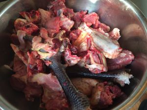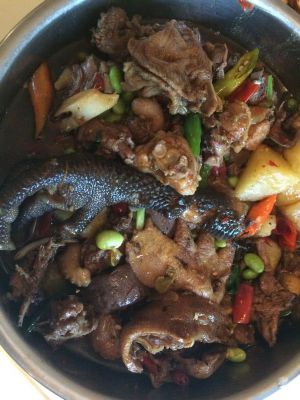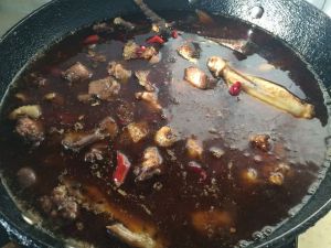 四川菜籽油倒入锅烧冒烟,放入鸡肉炒一会,在放入豆瓣酱,辣椒粉,干辣椒,一点袋装火锅底料,一点老抽,一点白糖。炒大概五至八分钟,出红色油飘起来后,倒入冷水盖过鸡肉。