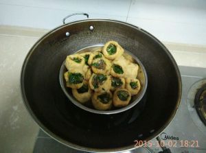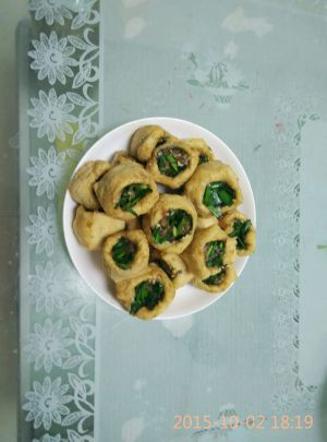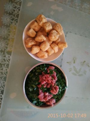 把韭菜切碎,肉碎,加上油盐(要够味,放咸些才香),酱油搅拌。豆腐泡洗净。