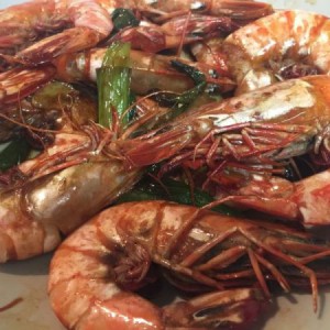 再次倒入少许橄榄油,放入姜片,葱段,(大葱切段)炒香放入虾继续翻炒两分钟,倒入兑好的汁,翻炒收汁,起锅