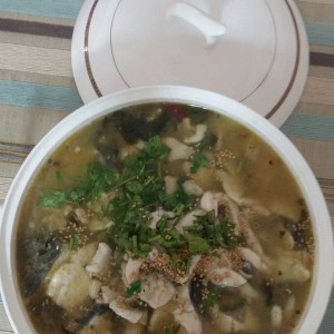 汤沸时,下鱼片,煮三分钟,一起倒在酸菜上