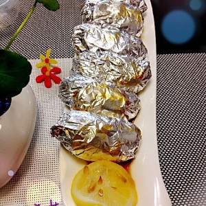 烤盘铺上锡纸,放上包好的鸡翅(锡纸有接口的地方朝上,这样会减少鸡汁柠檬汁的流失)。