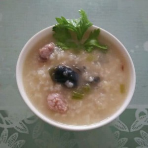 准备好瘦肉(用油,姜片,生粉,酱油腌好肉),皮蛋(切丁),西芹切丁,米2杯洗净泡一下。