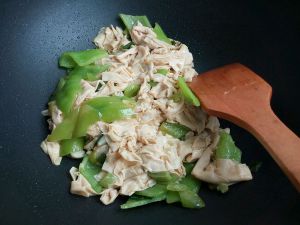 待锅中汤汁见干,加尖椒、盐、鸡精翻炒,加水淀粉勾芡出锅。