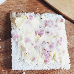 然后将培根土豆泥图到面包片上,再拿一片面包片 盖上。切成方块