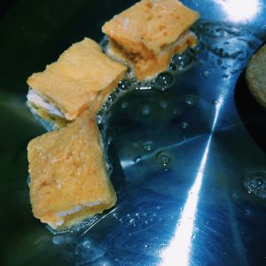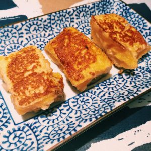 然后将切好的培根土豆面包块裹上鸡蛋液,入锅小火煎 记得要及时翻面ʕ •ᴥ•ʔ