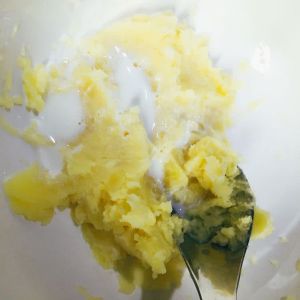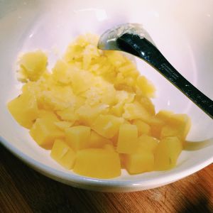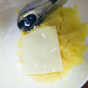 将土豆摁成泥~( ´ ▽ ` )ノ 将芝士片加进去(喜欢芝士味道的可以多放几片),和土豆泥搅在一起 拌均匀喔。不要加水~