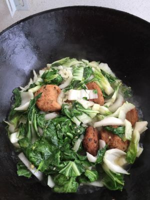 热锅冷油爆香姜末,放青菜炒至半生放藕圆,小半杯水盖上锅盖中火焖5分钟,开盖,少盐(尽量不放味精)起锅!