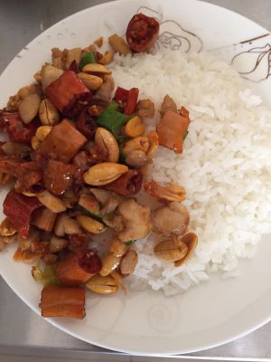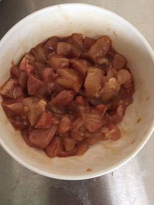 家里没有鸡胸肉只有鸡腿,切小丁,倒入生抽,淀粉,料酒腌制10分钟进进滋味,将锅里倒入油(比平常做饭多一点)倒入肉翻炒差不多熟了成出来,留油放入葱姜辣椒,再倒入肉
