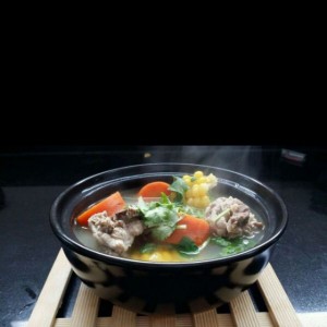 排骨入锅,小火一刻,入胡萝卜,玉米少姜,大火烧开,转小火炖,入盐香油,醋各少许,两刻即可。