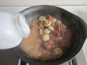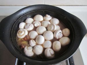 下入洗干净的口蘑,加盖再煮上十分钟;