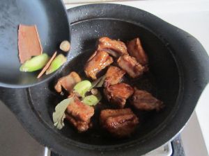 将排骨水分炒干, 这时排骨也上色后下入大料一起煸炒;