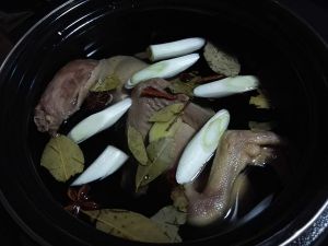 将鸭子放入电压力锅,加水没过鸭子,放姜,葱,料酒,老抽,八角,桂皮,香叶,盐,按下煲汤键,设置压力40,时间15分钟,等待操作完成听到提示音即可