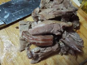 捞出鸭子沥干汤汁斩块