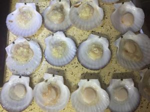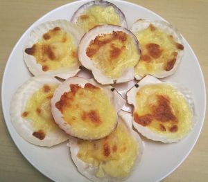马苏里拉芝士铺满扇贝,洒上胡椒粉。烤箱预热十分钟后,扇贝放进烤箱180度12分钟,看到芝士变色就OK!