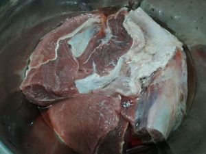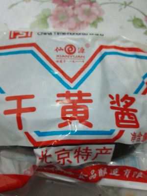 干黄酱泡水,水量为炖肉的量,化好后慢慢倒入锅中,剩下渣滓不要。我第一次找到干黄酱,要比黄豆酱浓的多,是结成大块的。品牌不限。