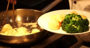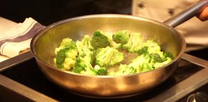 等锅热了加一点底油,开始炒西兰花,放入适量的盐、糖,勾一点芡。