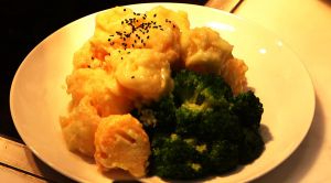 把蛋黄酱清一下,倒入虾球。然后把蛋黄酱均匀地裹到虾上。一个一个摆到盘子里。最后撒上黑芝麻