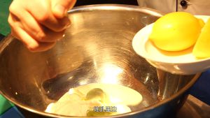 做青芥虾球的酱:放入青芥辣、蛋黄酱、炼乳,把柠檬汁挤到炼乳里面,然后调匀
