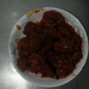 锅里放油,入白糖,醋,加适量水,炒匀,入水淀粉,入炸好的排骨迅速炒匀出锅装盘。