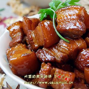 锅洗净,放入1汤匙(15ml)的油,放入冰糖煮化,待冰糖液颜色变深时,倒入炒过的五花肉块,翻炒均匀。