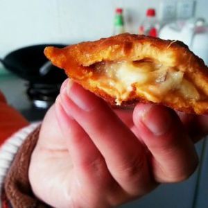 撒一些糯米粉在手上 取乒乓球大小的南瓜面揉成球 压扁。把外圈的部分捏得稍微薄一些 把适量香蕉泥放在南瓜面上 然后像包包子一样把四周的南瓜面叠上来 然后轻轻按下去 包住香蕉泥