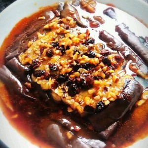 接着放醋 生抽 麻油 老干妈 份量拿不准就边放边尝 搅拌均匀