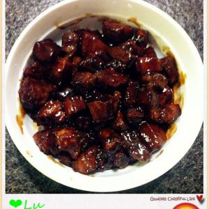 锅中倒入1汤匙油,放入冰糖煮化,待冰糖液颜色变深时,倒入五花肉块,翻炒均匀。然后加入料酒、生抽、老抽炒匀。