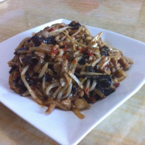 倒入笋丝和木耳丝翻炒,然后加入调好的汁,翻炒至汤汁粘稠即可。