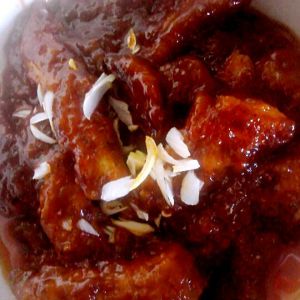 锅里油继续加热 把刚炸好的肉放入调好的汁里 再次下油锅炸 至表面金黄 出锅装盘