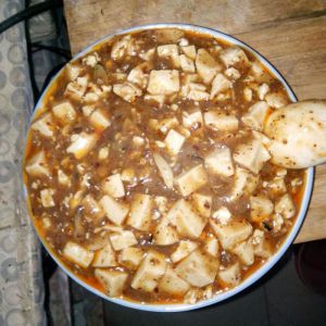 一勺芡粉,加水搅拌均匀淋在豆腐上,翻几翻既可。超级简单。。。