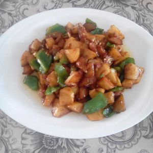 锅内放点油葱姜煸香,导入茄子土豆和撕成小块的青椒,倒入老抽,糖,盐和耗油翻炒!