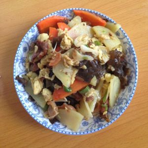 下锅炒。 先把葱姜算下锅 后加肉爆炒。在那胡萝卜 黄瓜。待熟加味精