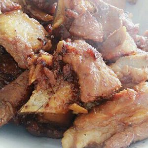 锅里放油,油热些的时候放糖,慢慢融化,成微红色,放排骨翻炒(注意:排骨要排干水,不然会溅油)炒至上色,放如蒜和姜,继续翻炒