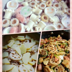 土豆,藕,金针菇,洗好切开,下水焯八成熟……