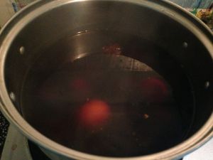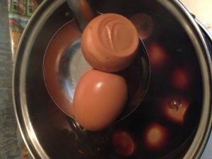 将包好皮的鸡蛋均匀涂抹上一层老抽酱油后放入锅中继续煮1个小时。