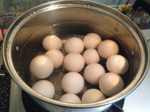 鸡蛋擦干净表面,放入冷水锅中煮熟。水开后三分钟关火,焖5分钟即可取出。过凉水冲洗后包好皮待用。